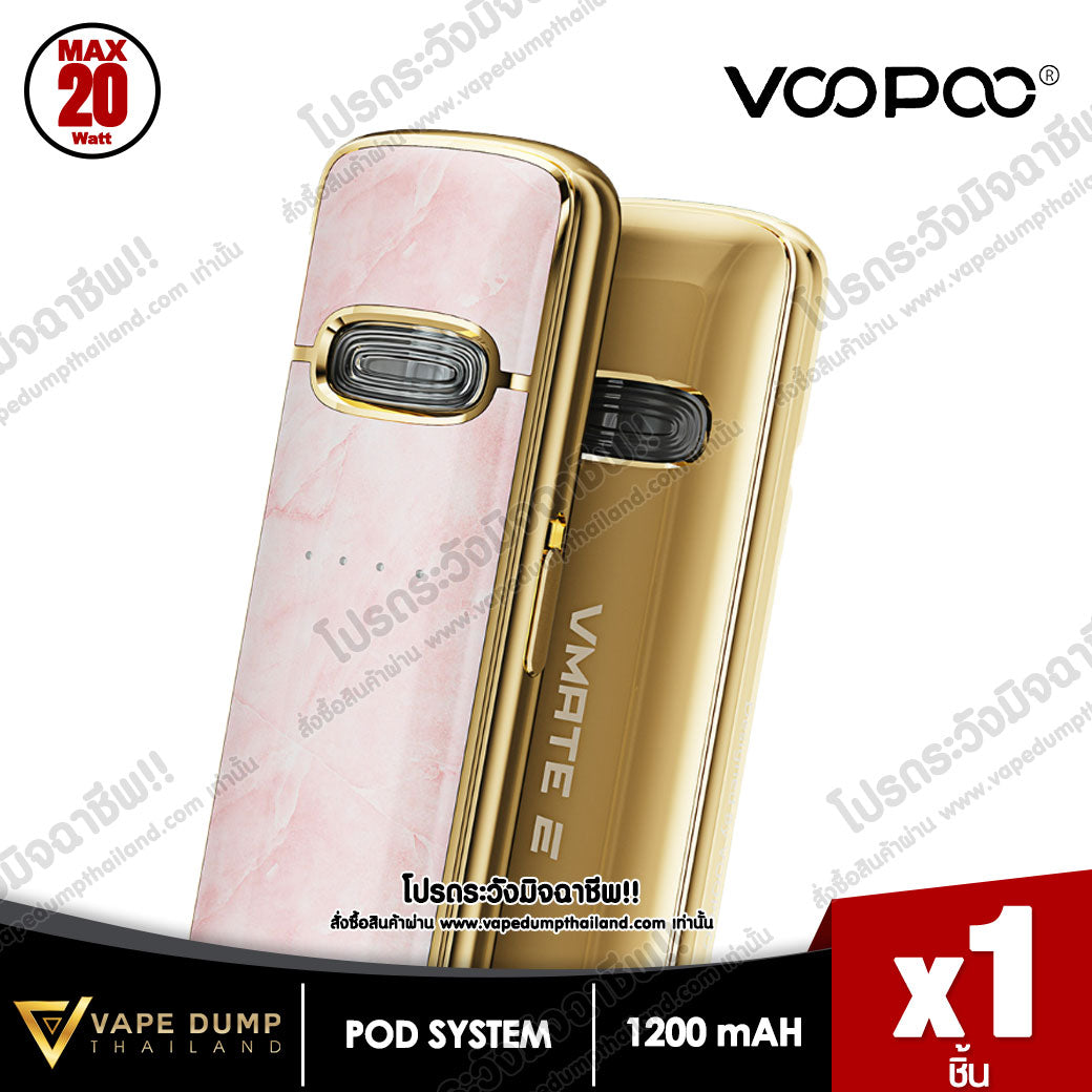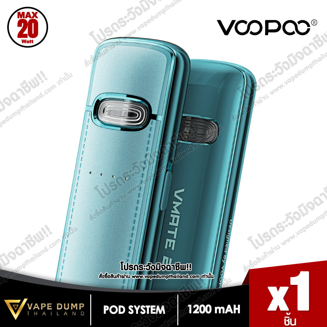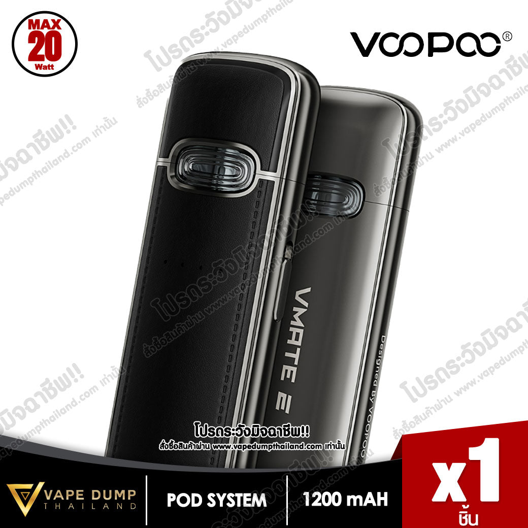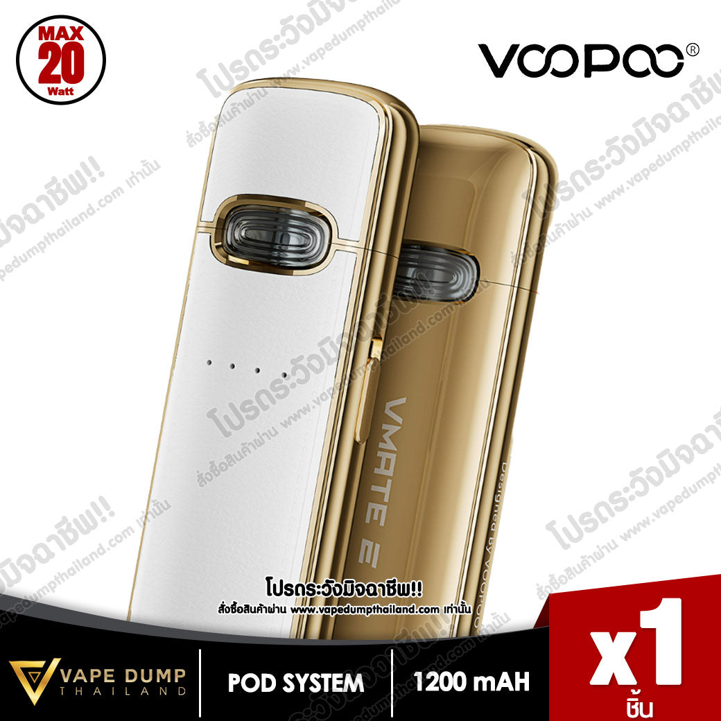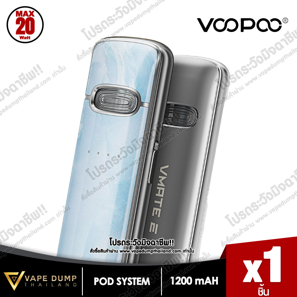VOOPOO VMATE E Pod Kit แบตเตอรี่ในตัว 1200mAh พร้อมการชาร์จแบบ Type-C จ่ายไฟสูงสุด 20W มีไฟแสดงสถานะ LED เพื่อแสดงความจุของแบตเตอรี่แบบเรียลไทม์ และจับคู่กับรีฟีล VMATE V2 ขนาดจุน้ำยา 3 ml โดยมีมาให้เลือก 0.7ohm และ 1.2ohm เพื่อประสบการณ์การรับรสชาติน้ำยาที่ยอดเยี่ยม