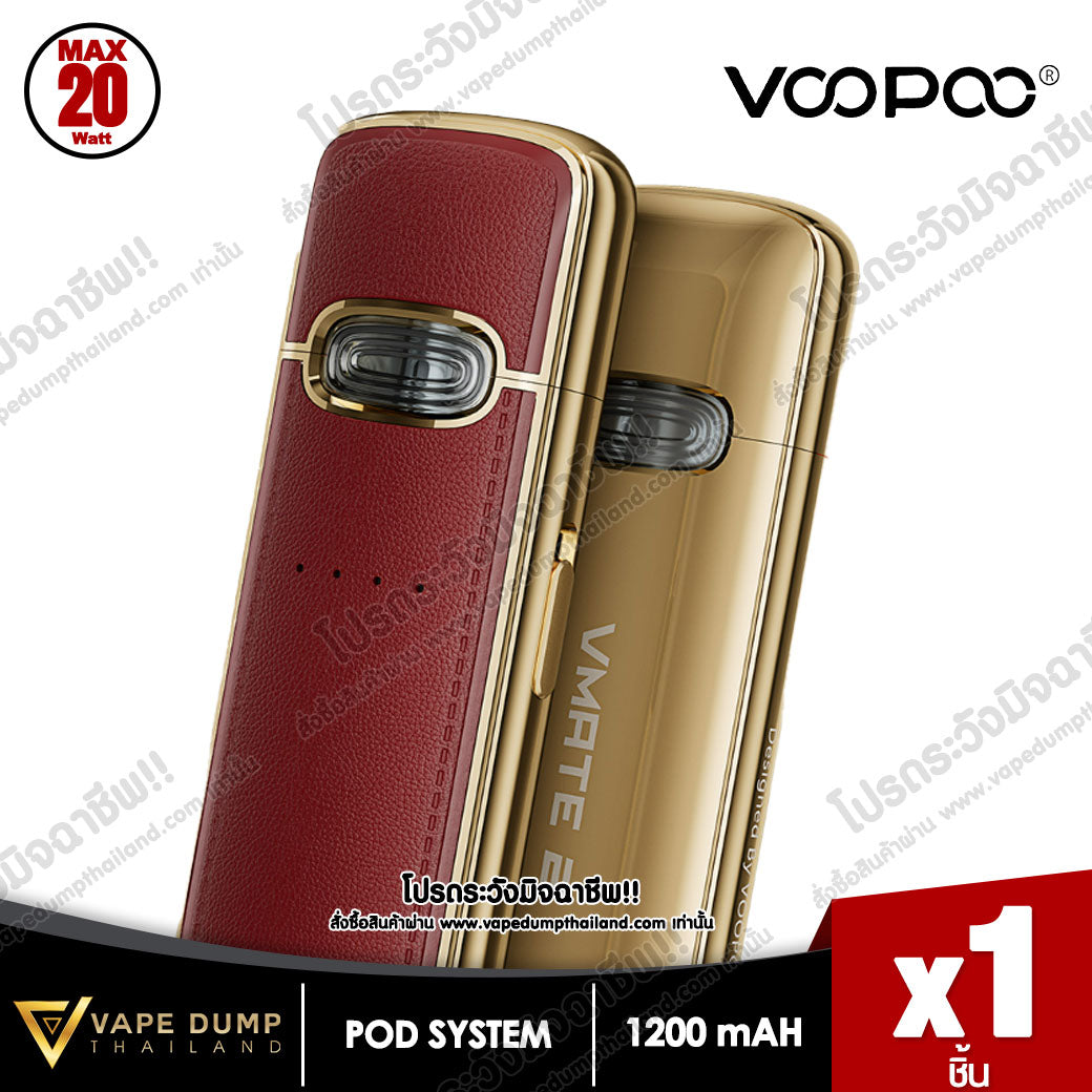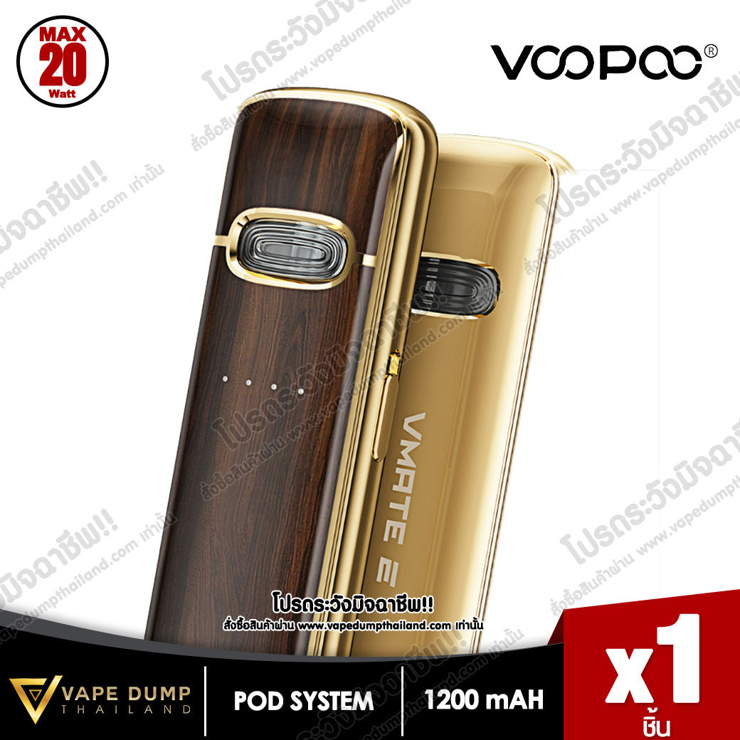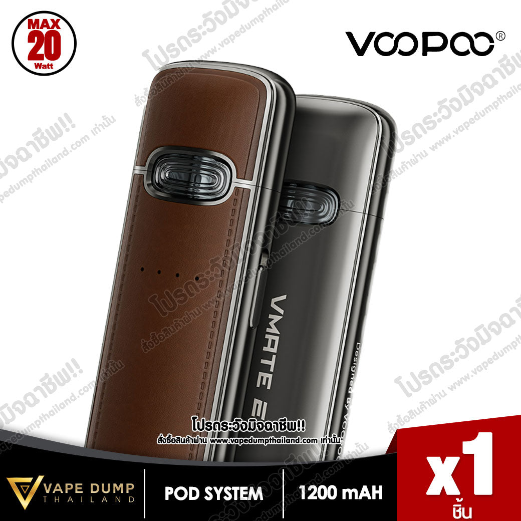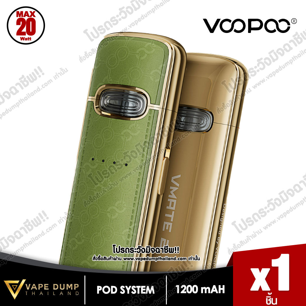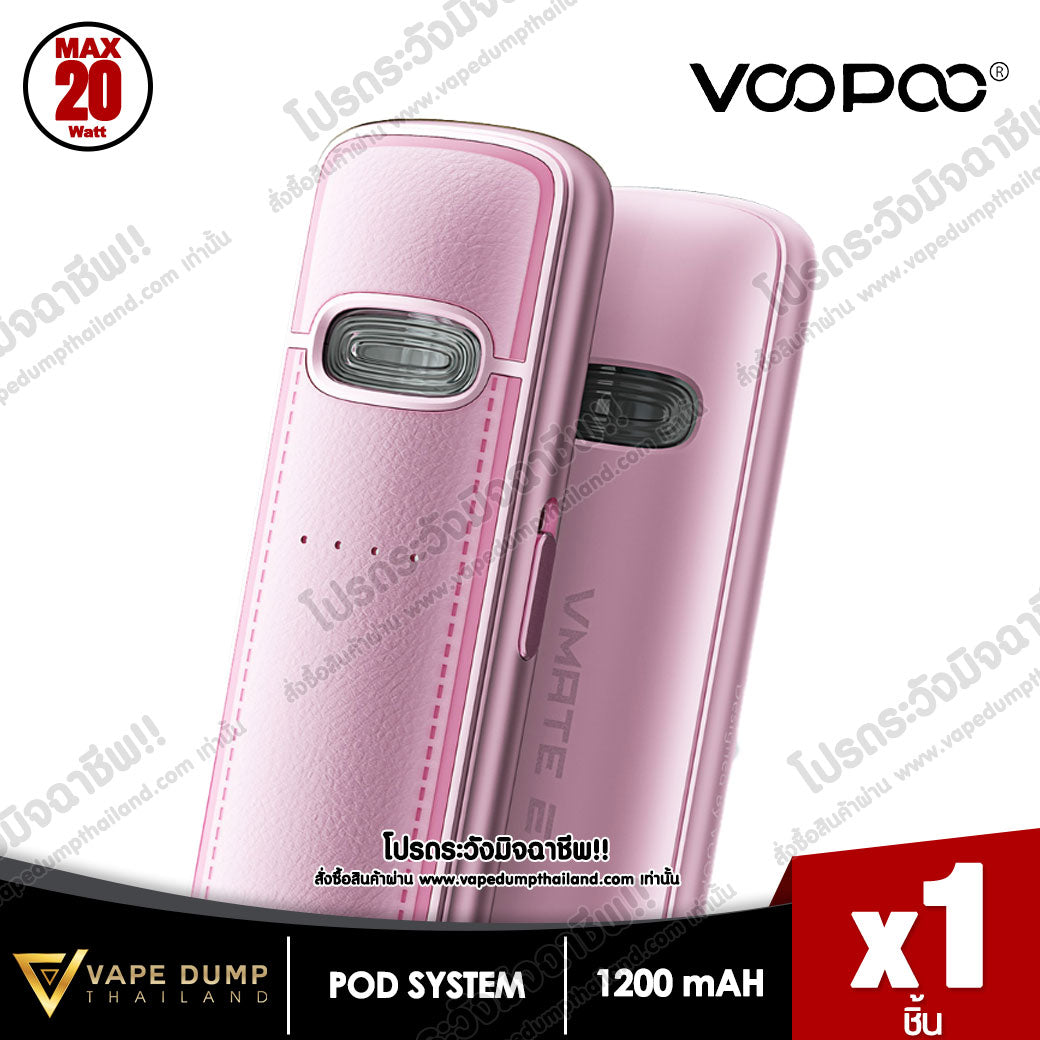 VOOPOO VMATE E Pod Kit แบตเตอรี่ในตัว 1200mAh พร้อมการชาร์จแบบ Type-C จ่ายไฟสูงสุด 20W มีไฟแสดงสถานะ LED เพื่อแสดงความจุของแบตเตอรี่แบบเรียลไทม์ และจับคู่กับรีฟีล VMATE V2 ขนาดจุน้ำยา 3 ml โดยมีมาให้เลือก 0.7ohm และ 1.2ohm เพื่อประสบการณ์การรับรสชาติน้ำยาที่ยอดเยี่ยม