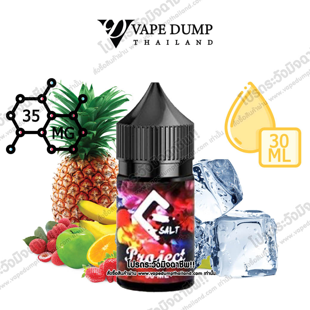 PROJECT FRUIT FACTORYเป็นน้ำยาซอลต์นิค ที่นำส่วนผสมของผลไม้นานาชนิด สัปปะรด ส้ม ลิ้นจี่ แอปเปิ้ล และอีกนานาพันธุ์ มีความหอม หวาน เปรี้ยว เย็นสดชื่นมากๆ ระดับความเย็น 4/5 |